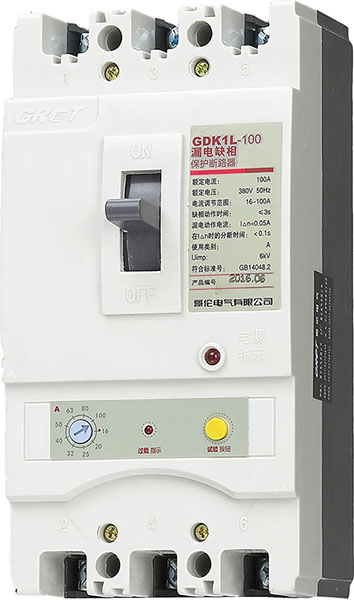 GDK1L系列漏電缺相保護斷路器適用于交流50Hz,額定電壓為380V,額定電流至100A的電源中性點直接接地的供用電系統(tǒng)中作為漏電保護之用。也可用來防止因設備絕緣損壞,產(chǎn)生接地故障電流而引起的電氣火災危險。及作為電機水泵的不頻繁啟動開關并可用來保護線路及電源設備過載和因低壓保護燒斷或電機繞組不通電造成缺相運行,都能及時可靠的起到漏電缺相自動保護作用。本產(chǎn)品無短路保護,需配置相同規(guī)格的熔斷器。
